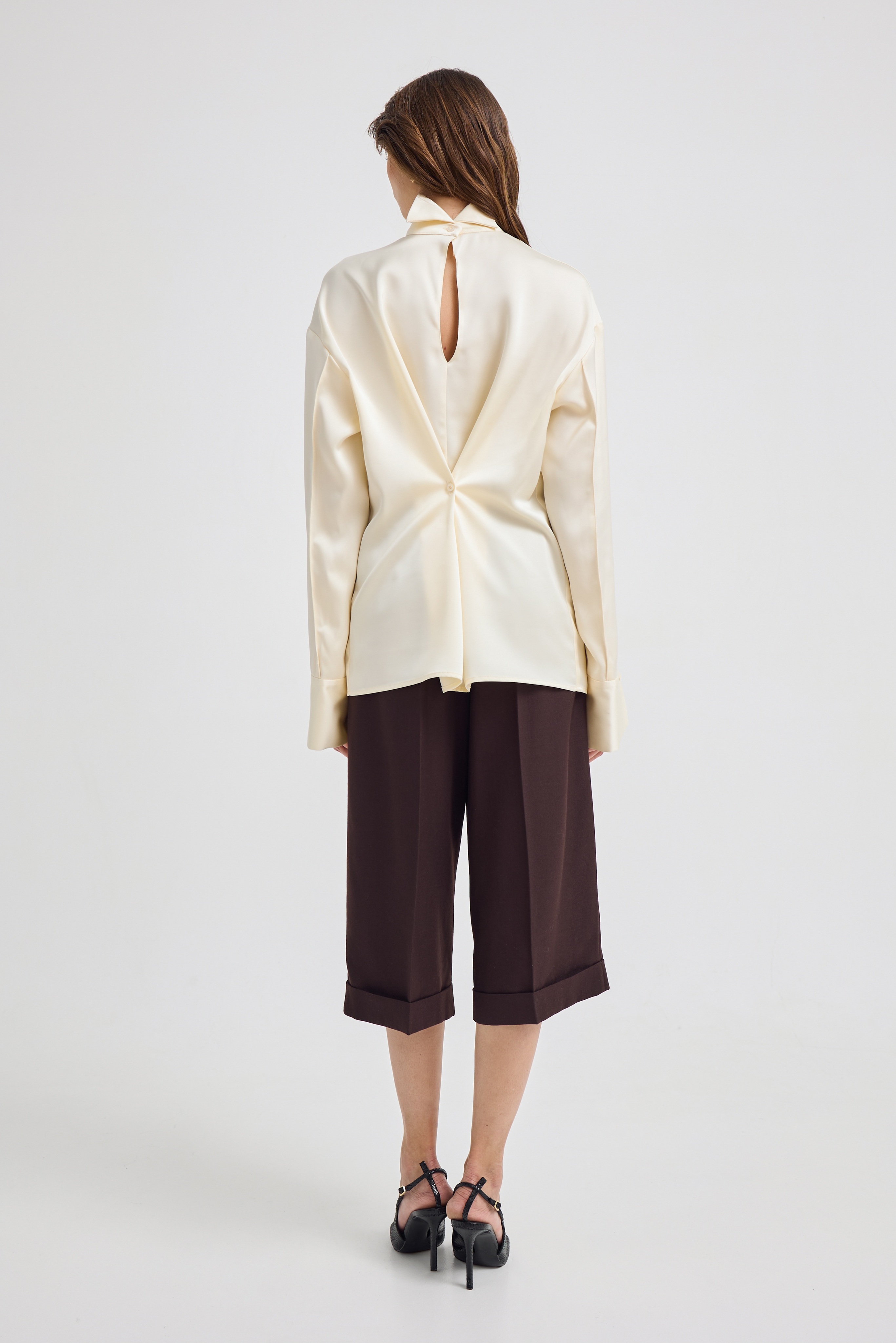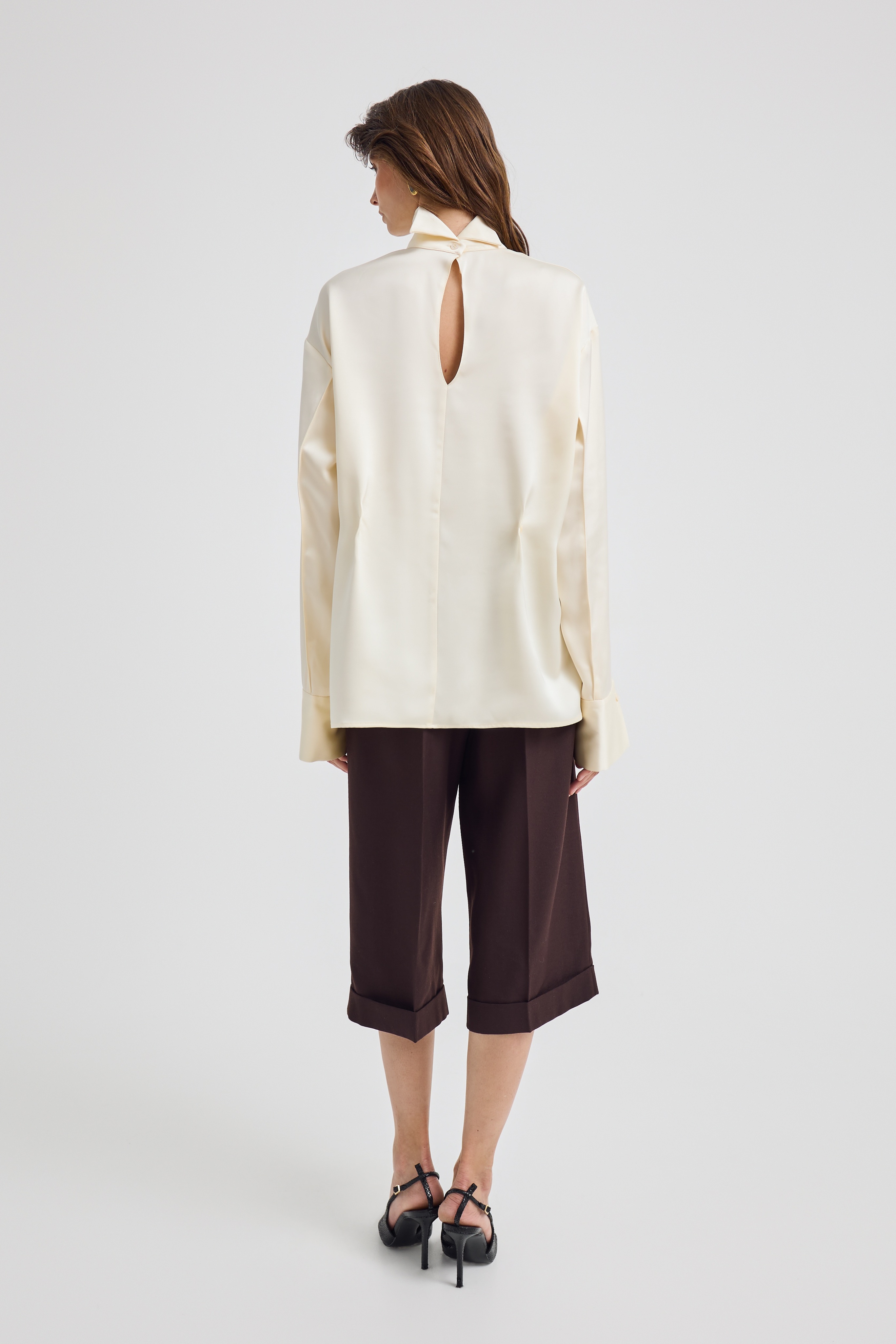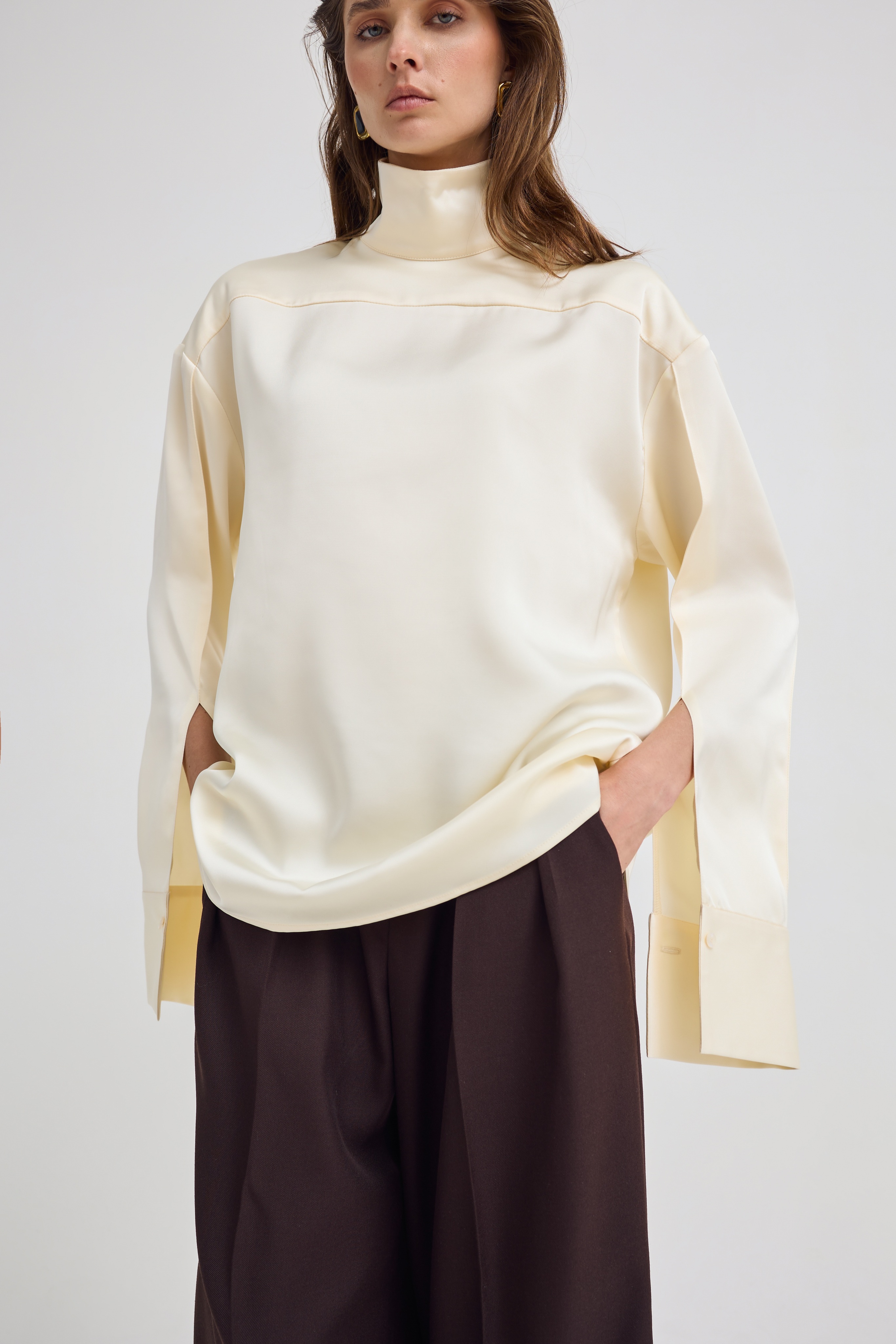 На первый взгляд кажется простой классической рубашкой, но мы решили переосмыслить этот образ — и перевернули его задом наперед. В результате получилась необычная блузка с воротником-стойкой, спущенными и нарочито растегнутыми рукавами, подчеркнув свободный крой и ненавязчивую оригинальность.
