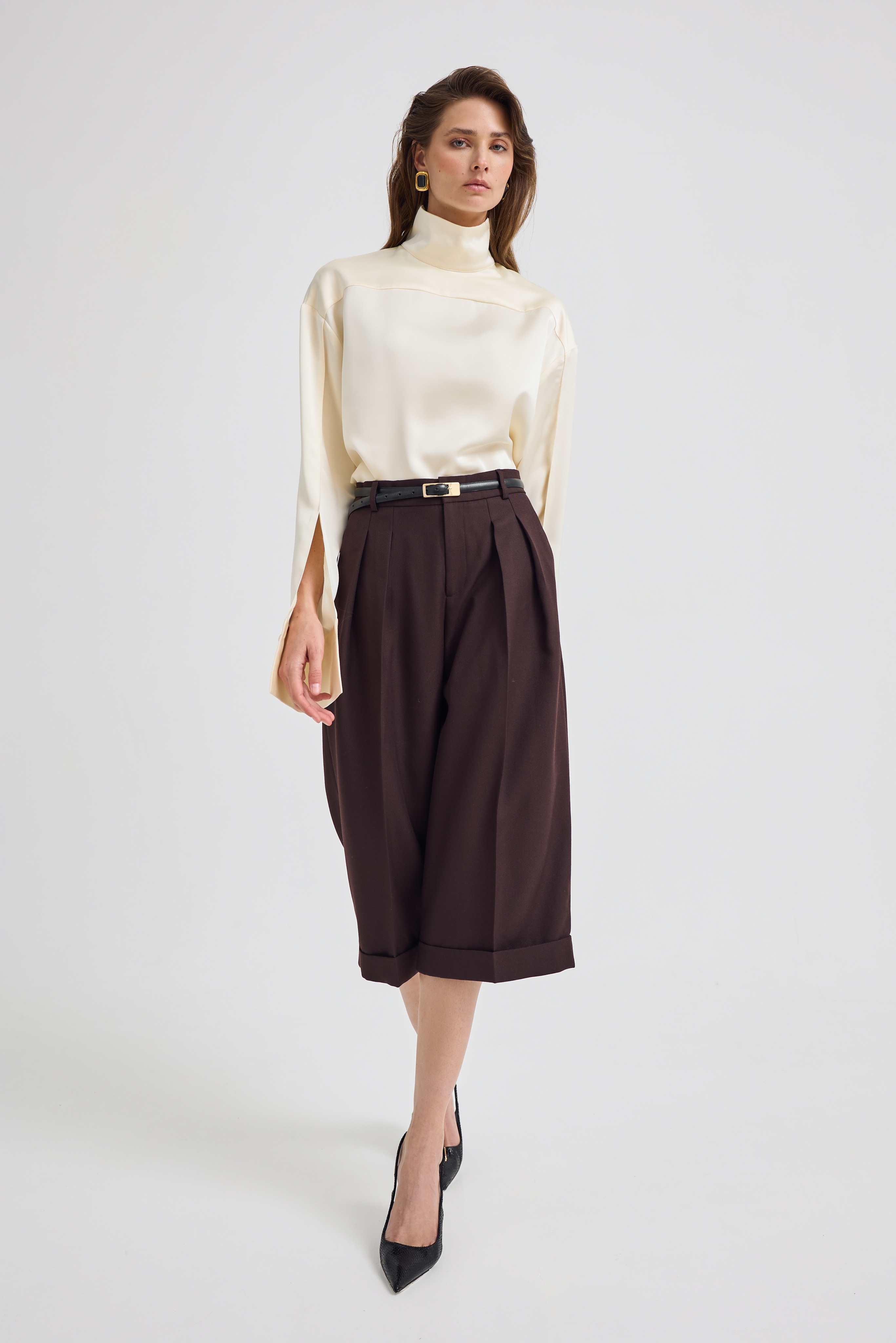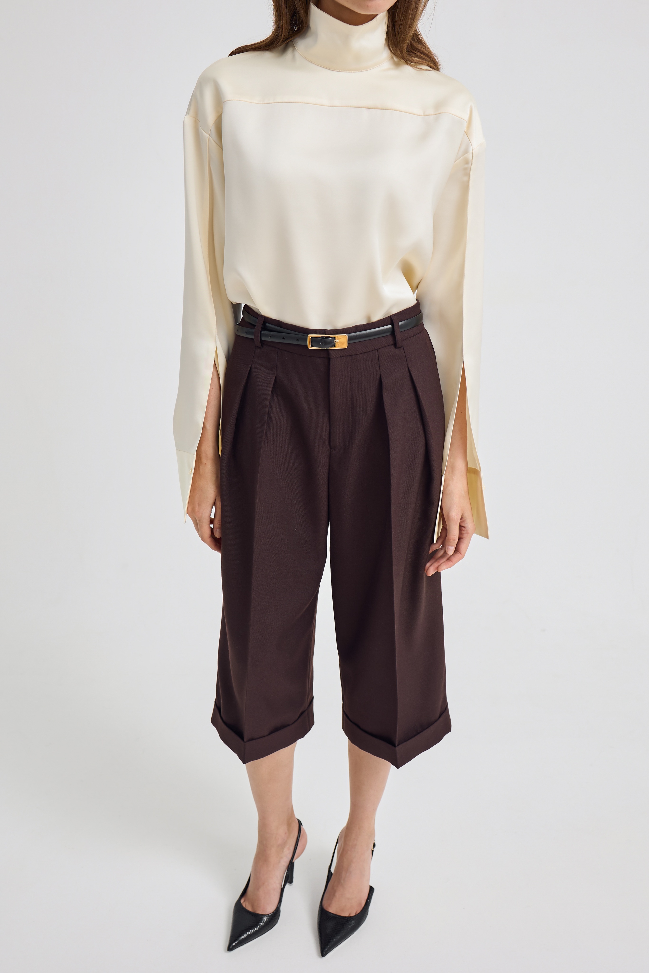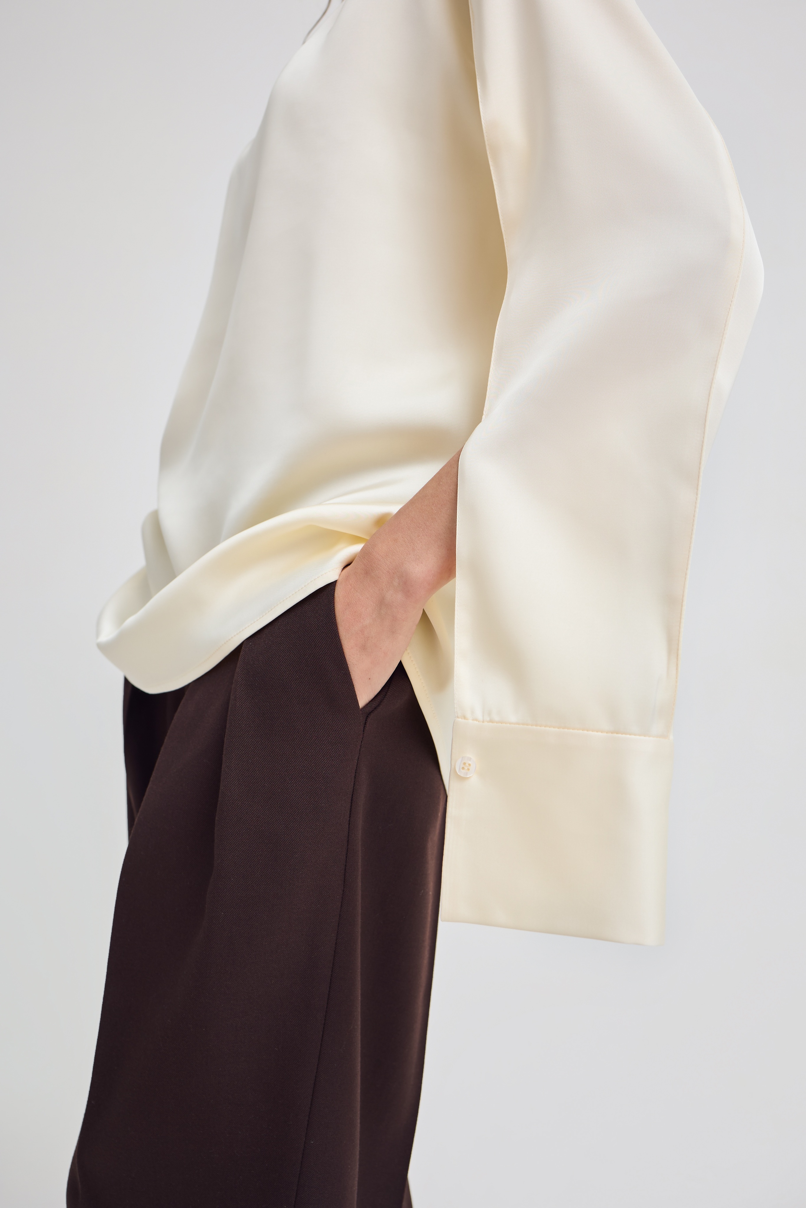 На первый взгляд кажется простой классической рубашкой, но мы решили переосмыслить этот образ — и перевернули его задом наперед. В результате получилась необычная блузка с воротником-стойкой, спущенными и нарочито растегнутыми рукавами, подчеркнув свободный крой и ненавязчивую оригинальность.