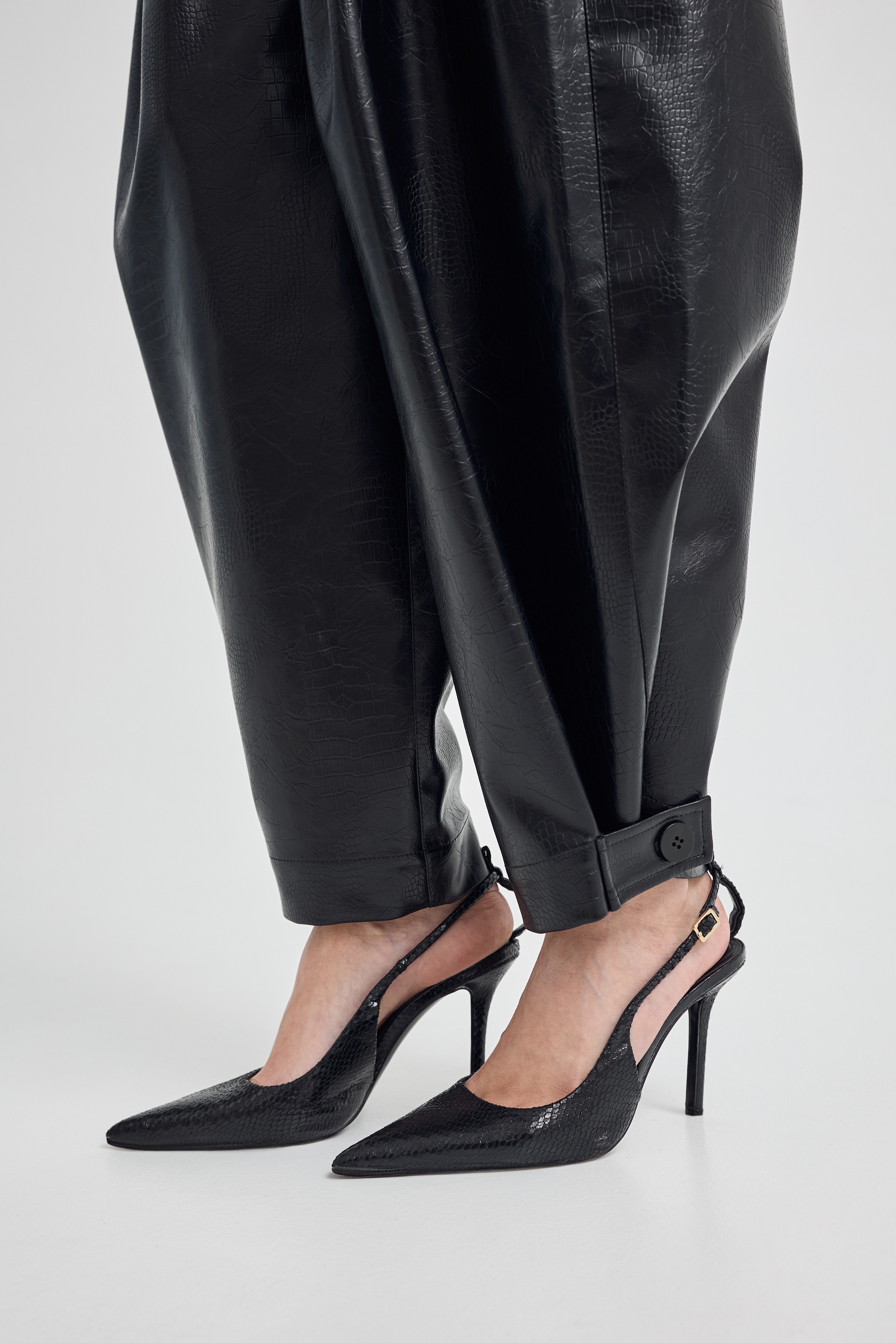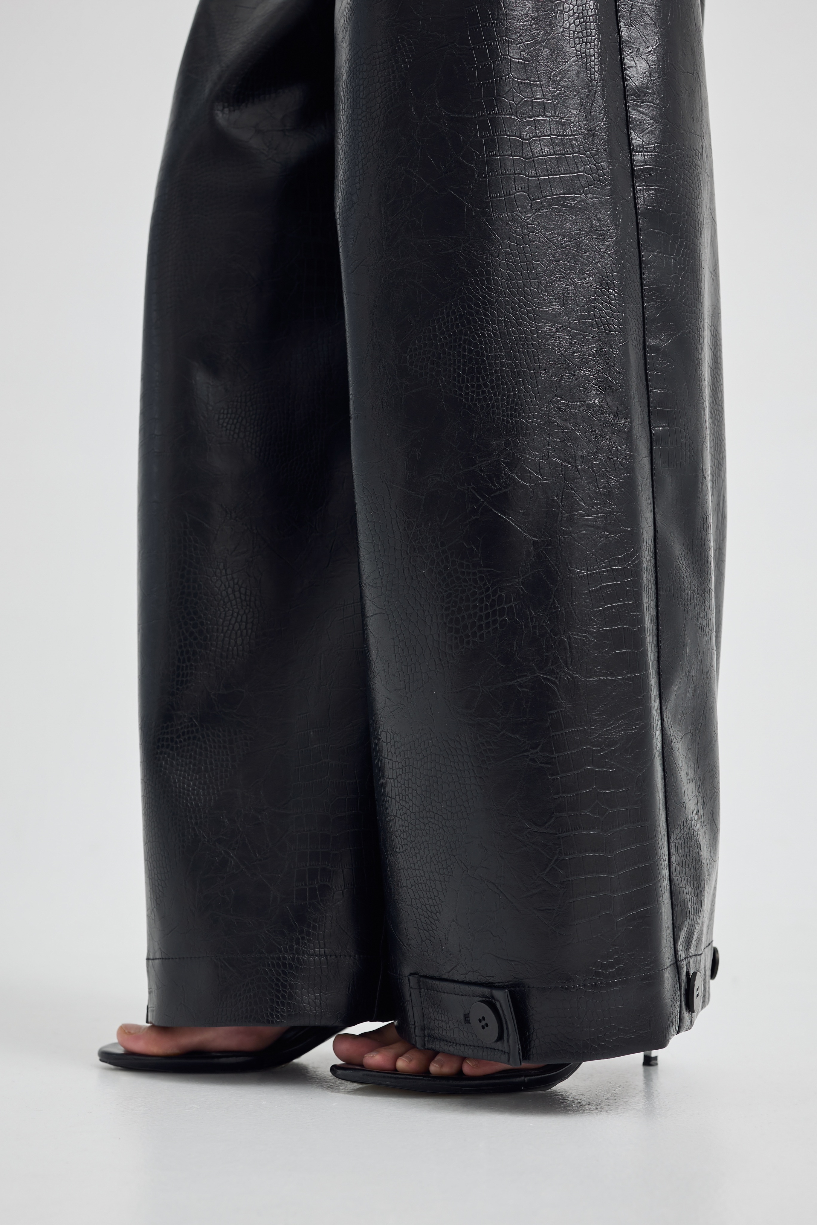 Брюки выполнены из качественной экокожи с прямым кроем и оснащены резинкой для комфортной посадки.