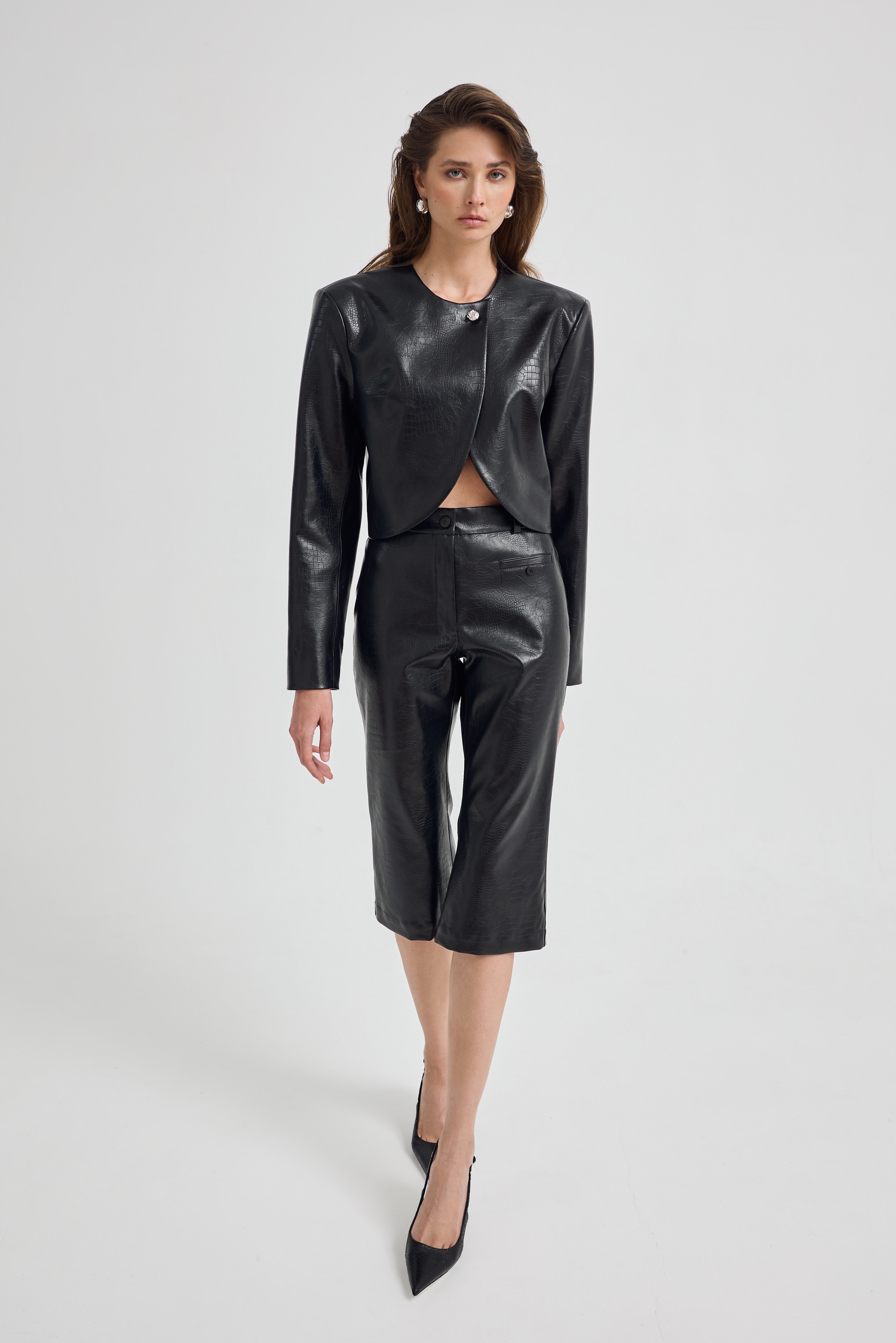 Актуальный фасон брюк идеально сочетается с популярной экокожей под крокодила — настоящий хит сезона.