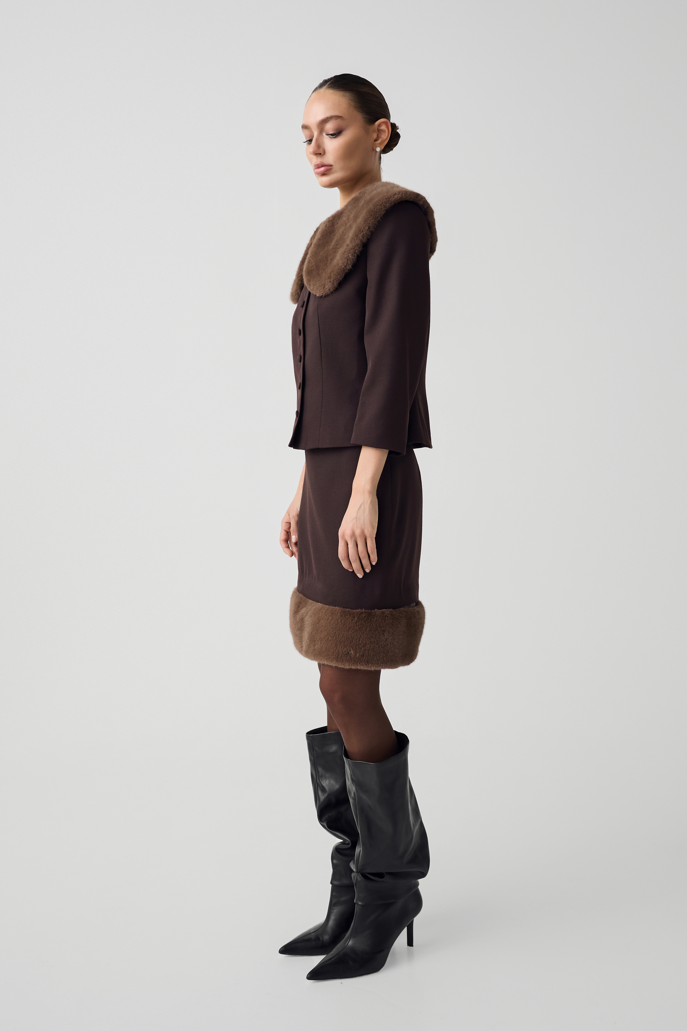 В состав комплекта входит жакет из шерсти со съемным воротником из меха, юбка с отстегивающимся мехом. Жакет притален, имеет рукав три четверти, обтянутые пуговицы, подчеркивая тем самым статусность изделия.