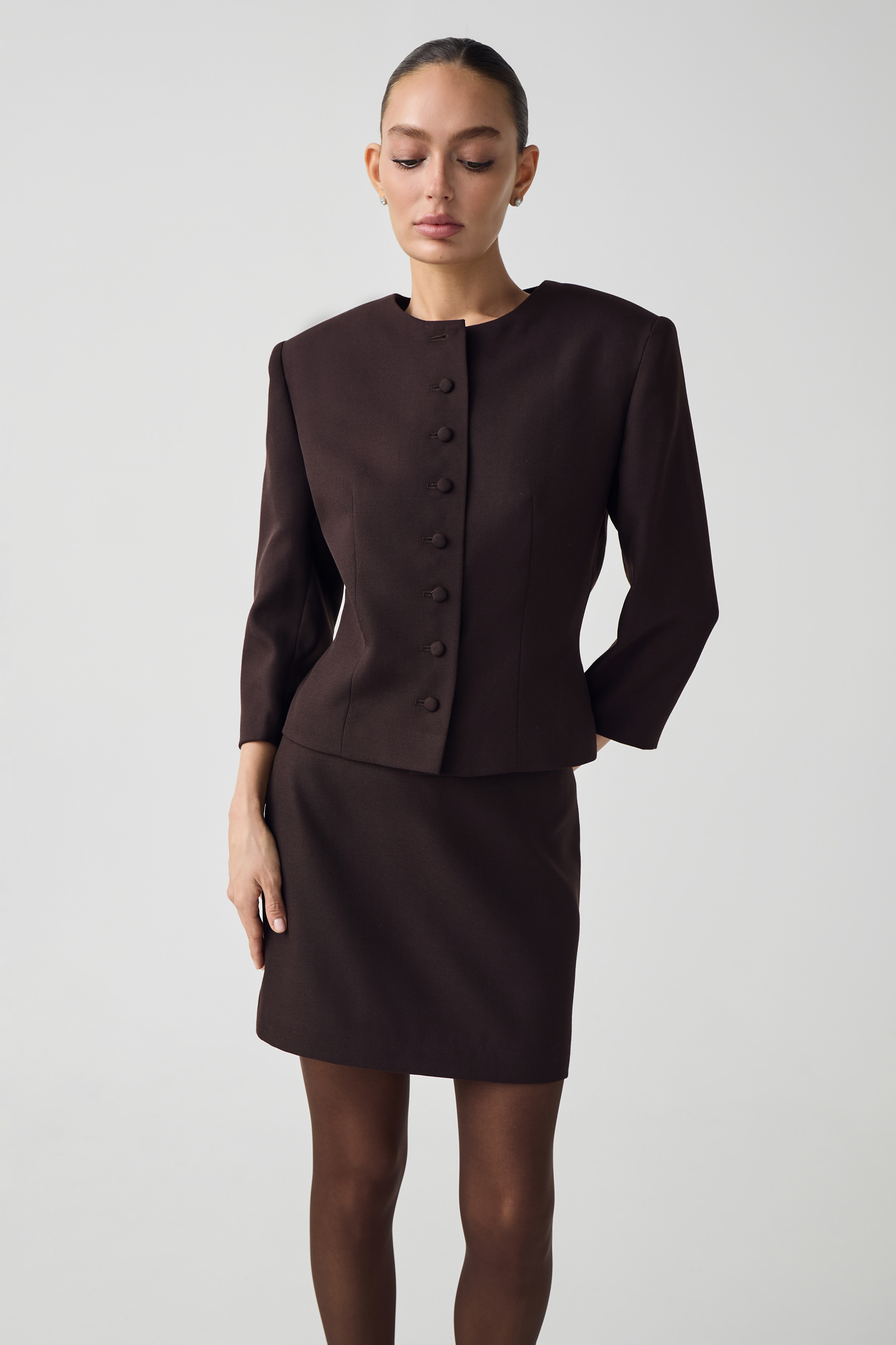 Юбка из шерсти с средней посадкой, в сочетании с укороченным жакетом создает гармоничный силуэт, посадка юбки продуманно сделана по жакет, сзади юбка достойно садится благодаря выточкам и потайной молнии сбоку.