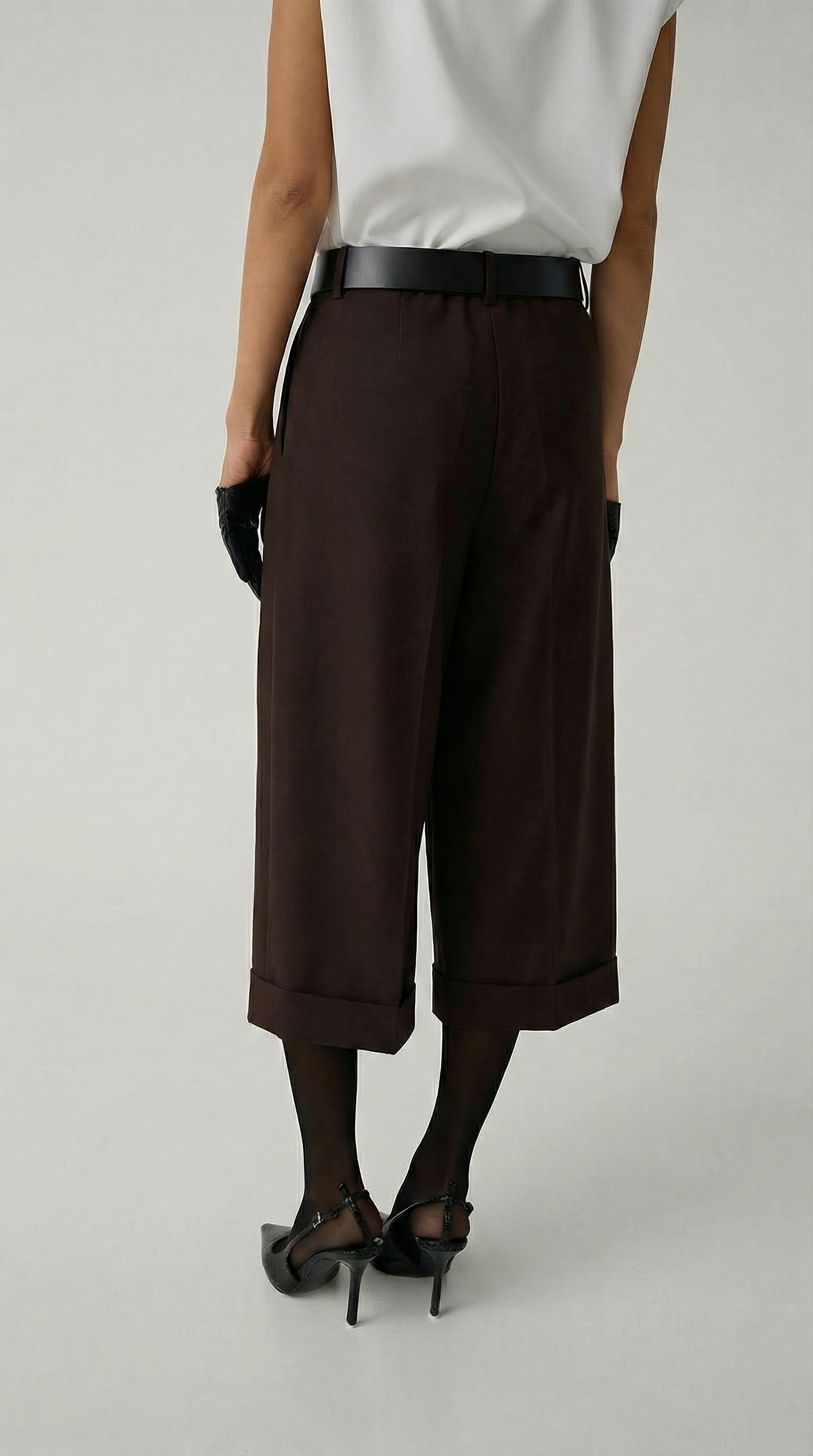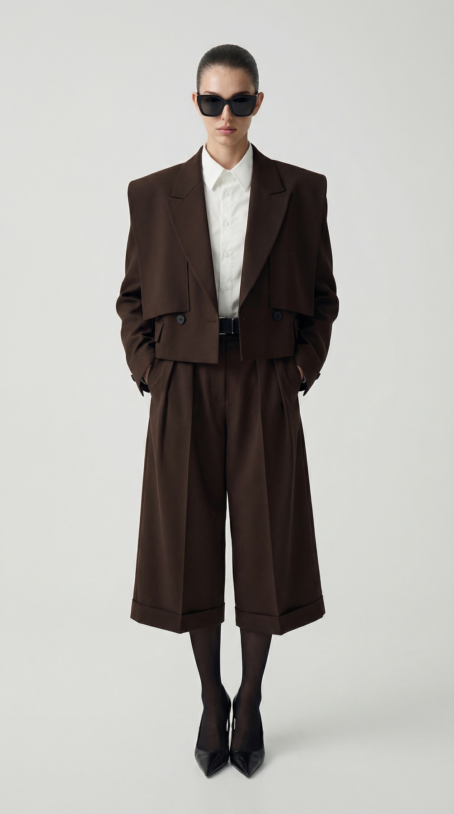 Наш бестселлер - кюлоты из шерсти в сочетании с укороченным жакетом с акцентными деталями в новом шоколадном оттенке шерсти.