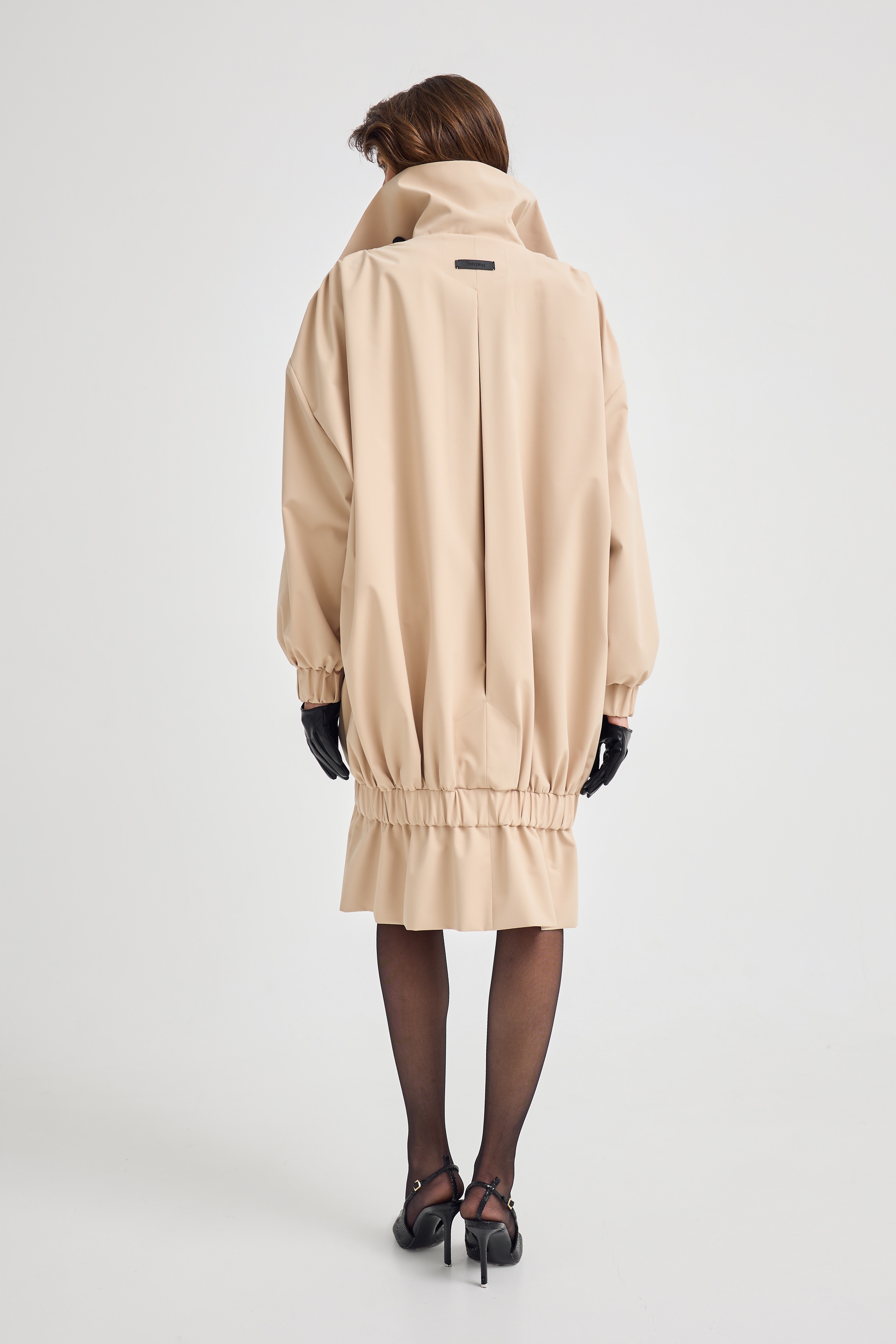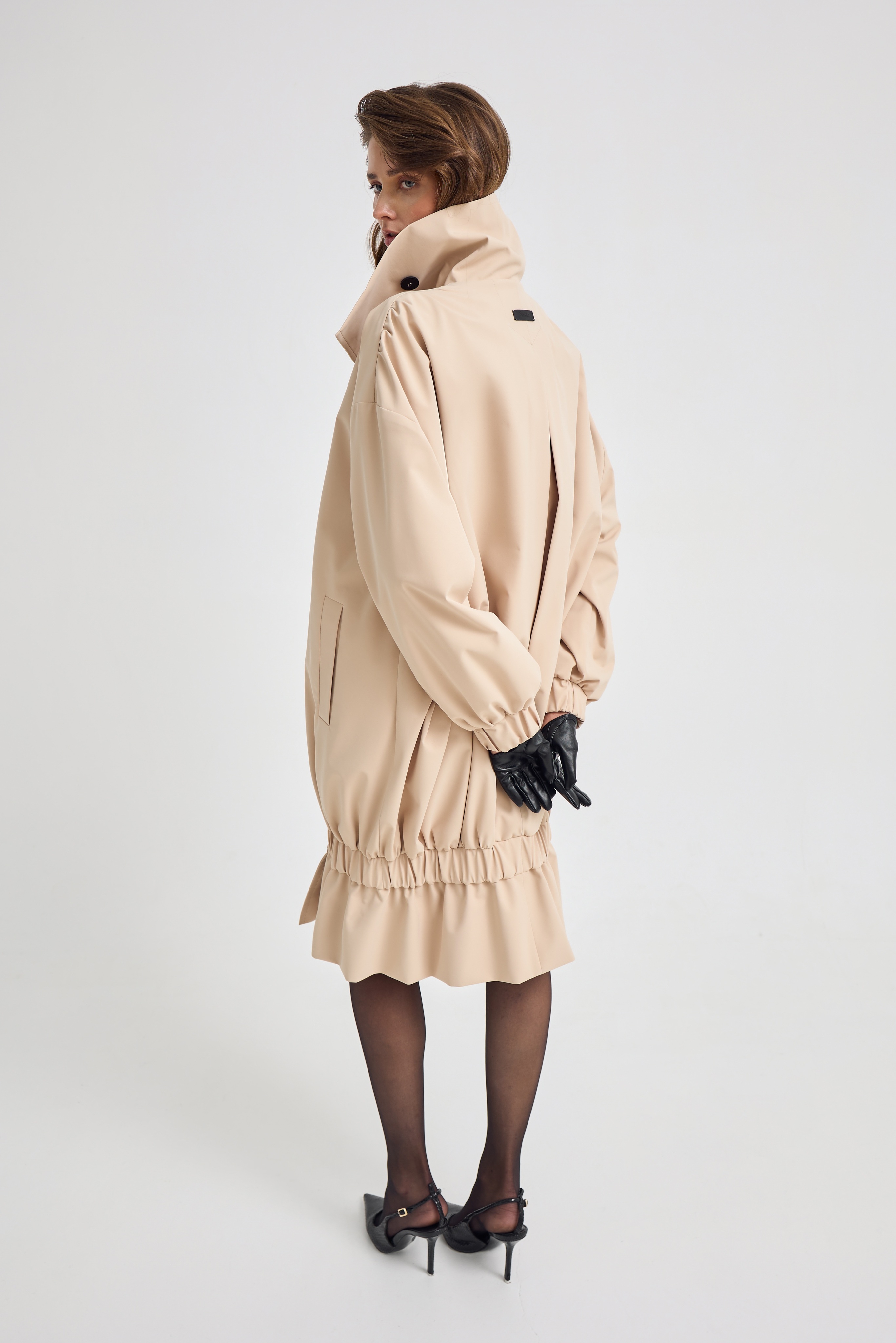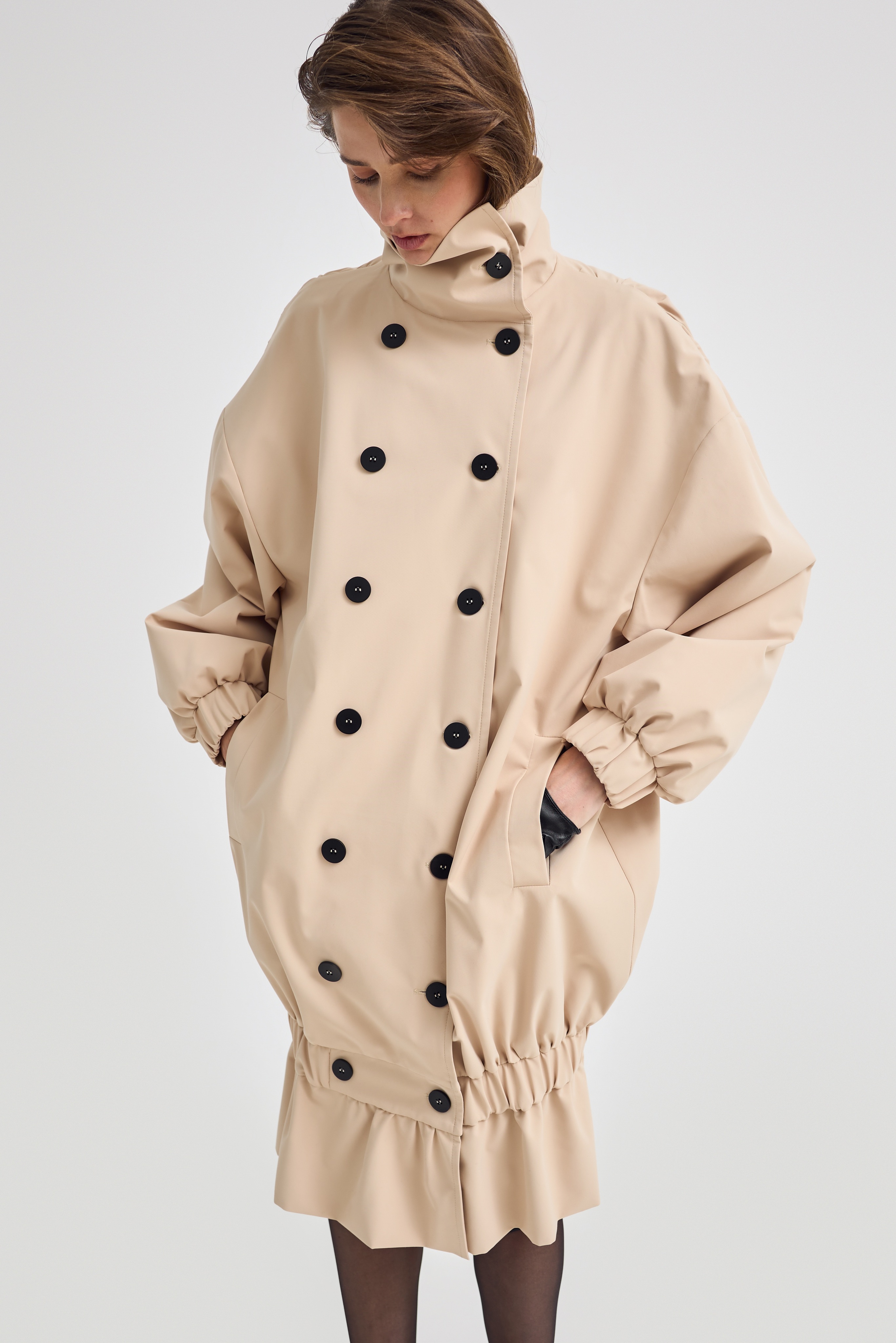 Резинка по низу позволяет трансформировать модель в укороченный вариант, меняя настроение образа за секунды. Носите его как классический тренч или создавайте более динамичный, акцентный силуэт.