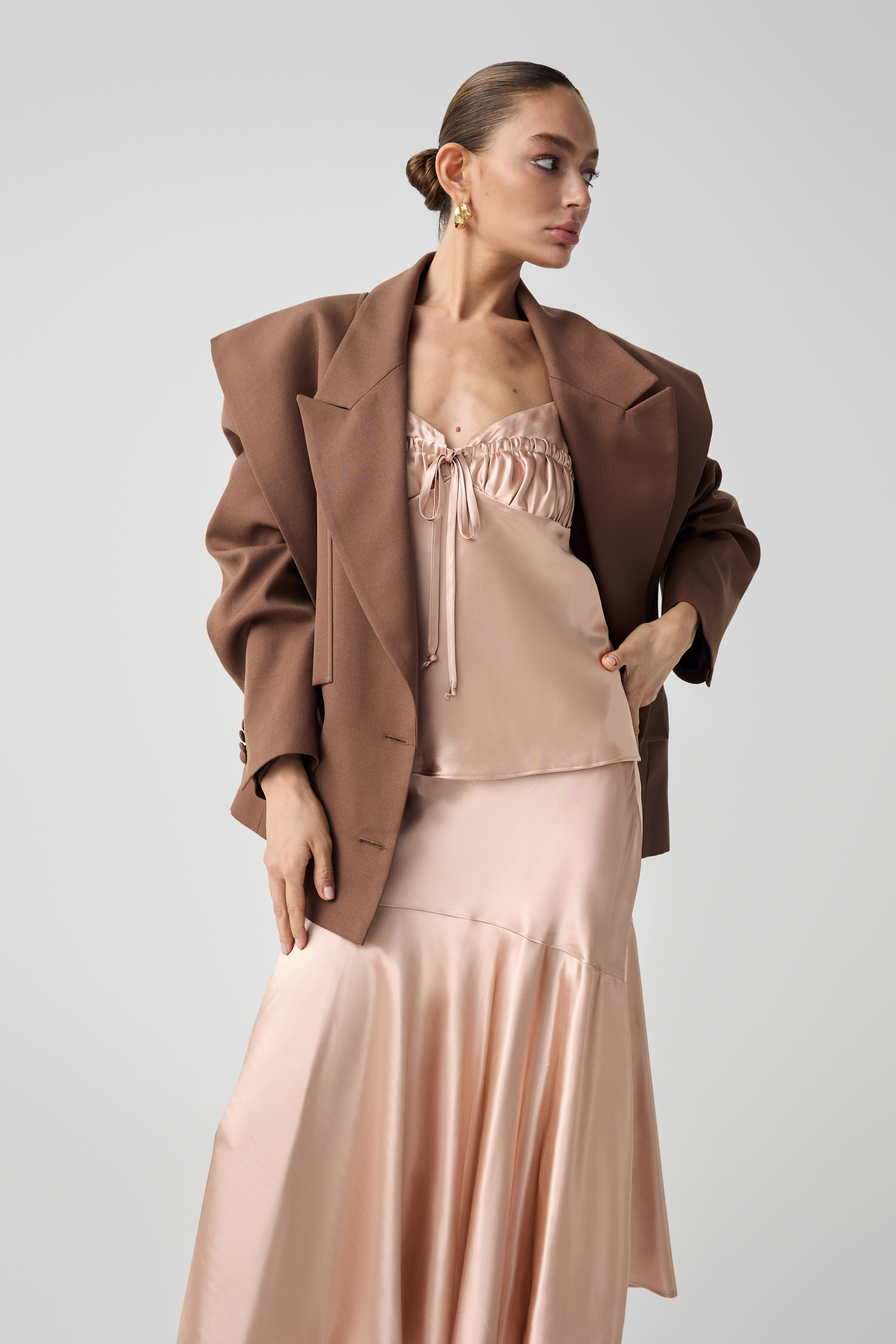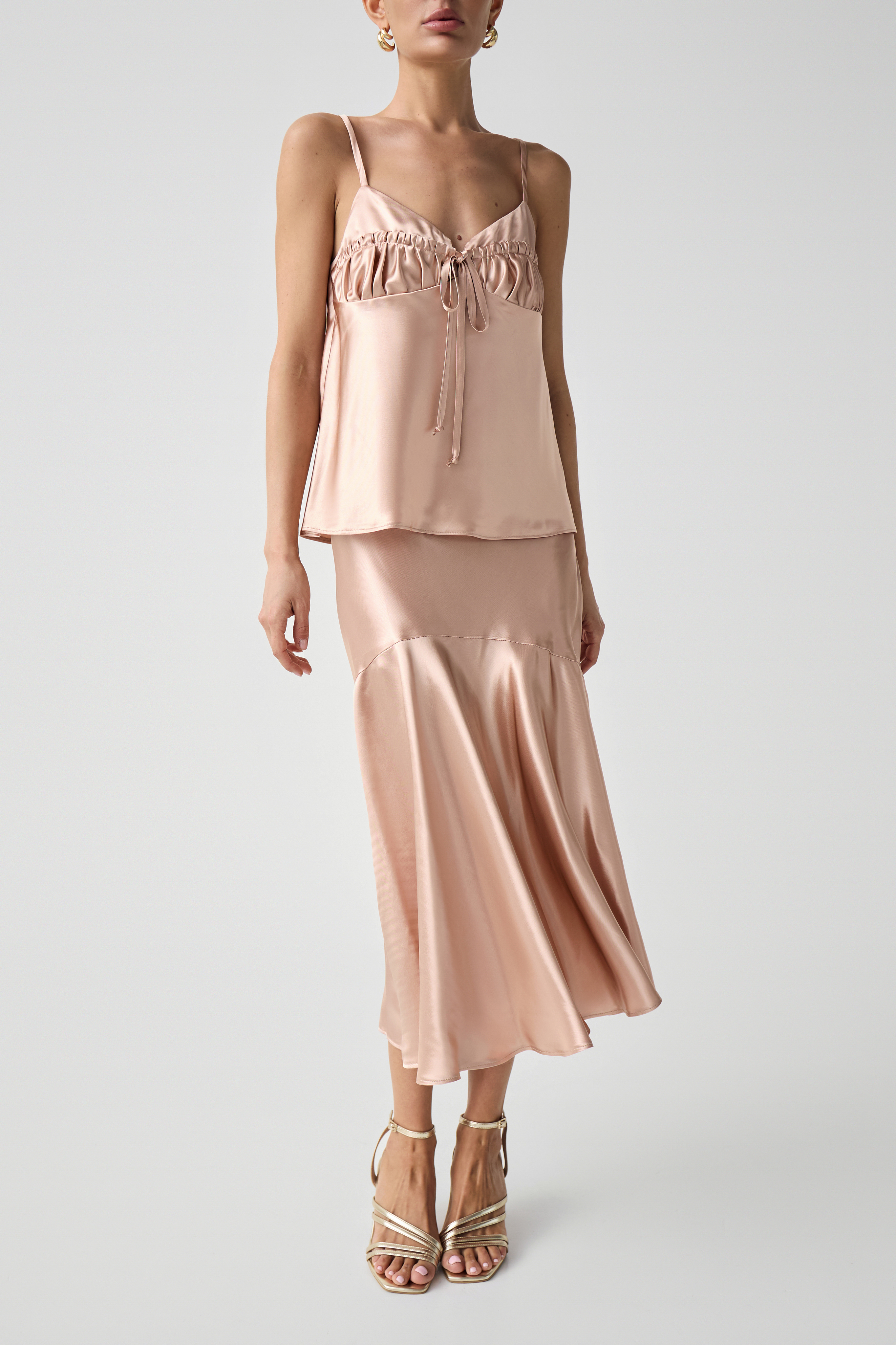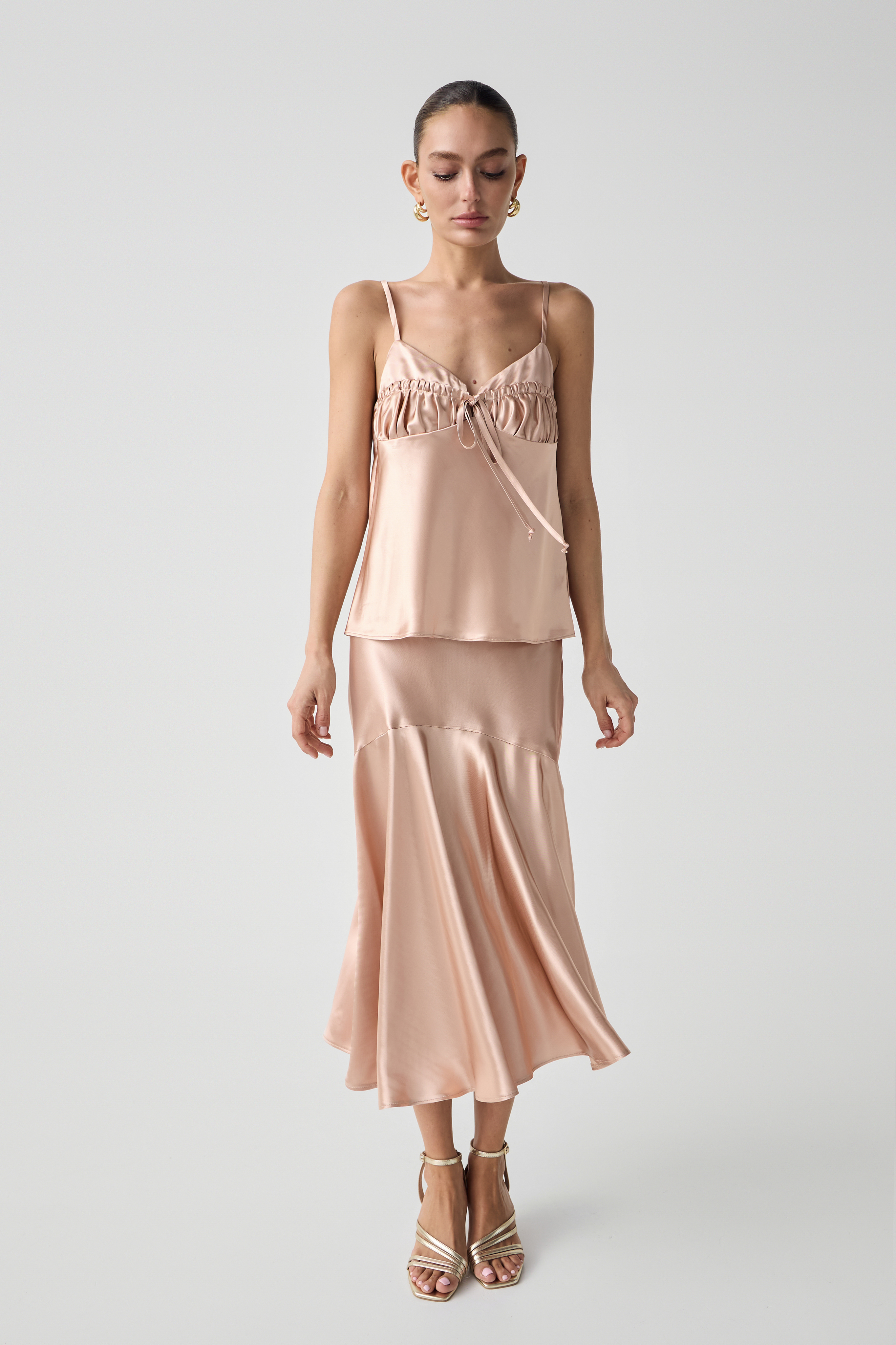 Юбка в бельевом стиле из премиальной итальянской вискозы - это воплощение легкости и утонченности. Юбка идет в дополнение к аналогичному топу, а сверху можно накинуть жакет.